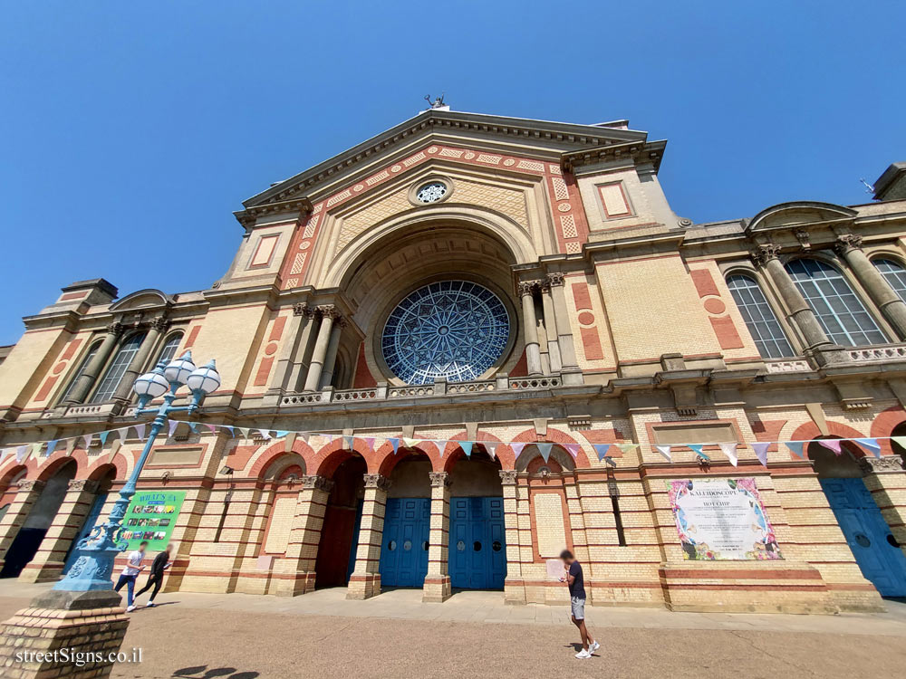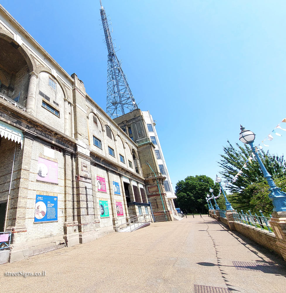 The location of the sign was photographed on the same day (with the transmission tower in the background) Click for a larger image as well as the main building of Alexandra Palace Click for a larger image.